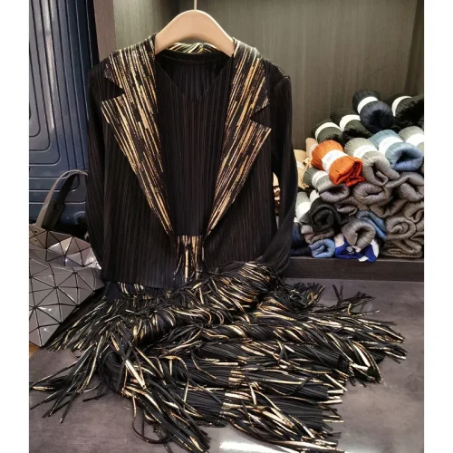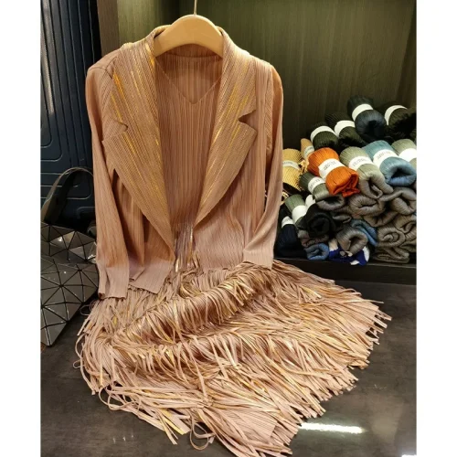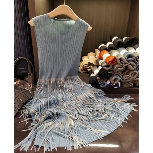 Product Name: Women’s High-End Fashion Two-Piece Set V-Neck Tassel Sleeveless Dress Pleated Cardigan Casual Loose Fit Solid Inspired Miyake