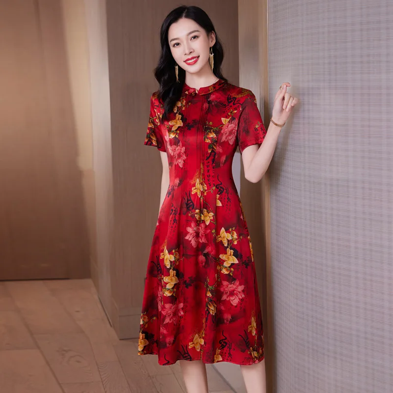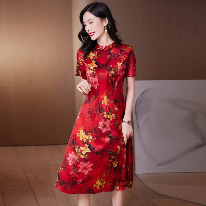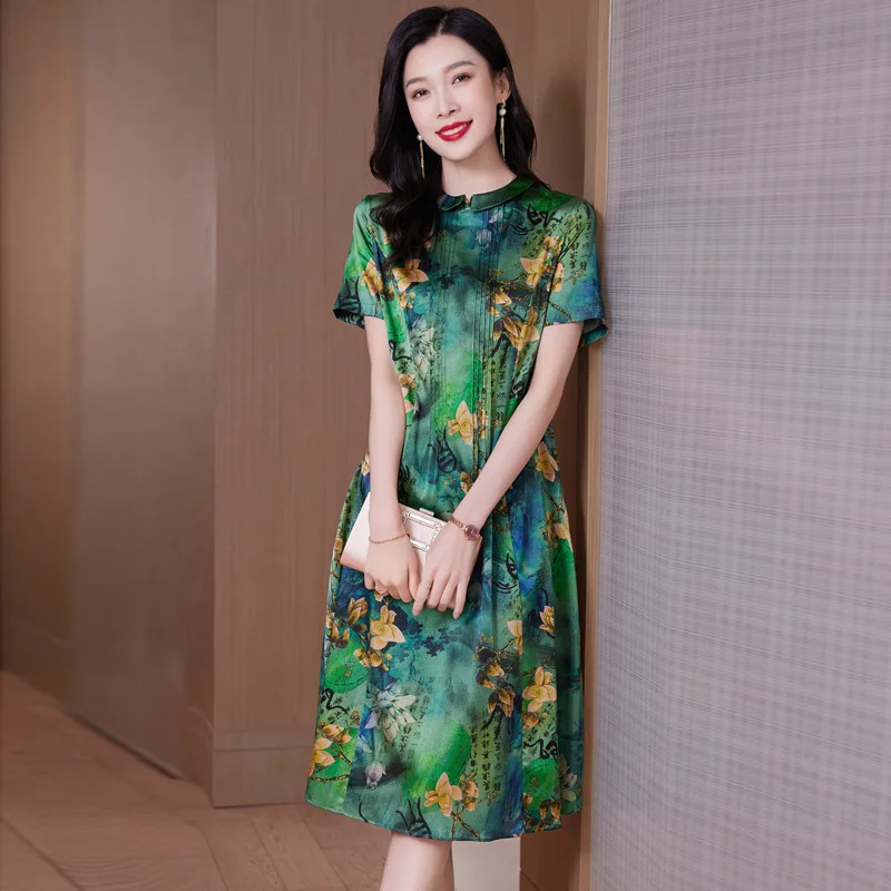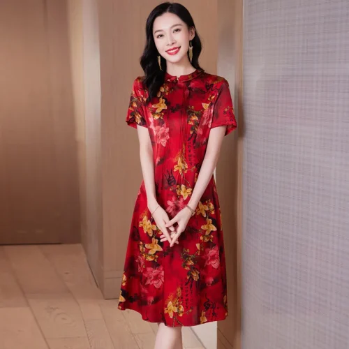 Product Name: Women’s Retro Floral Printed Satin Dress New Summer Collection with Natural Waistline Woven in Casual Style Silk Dress