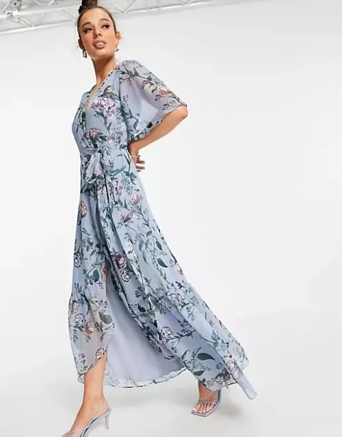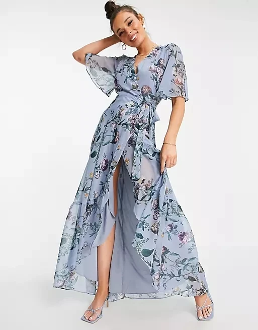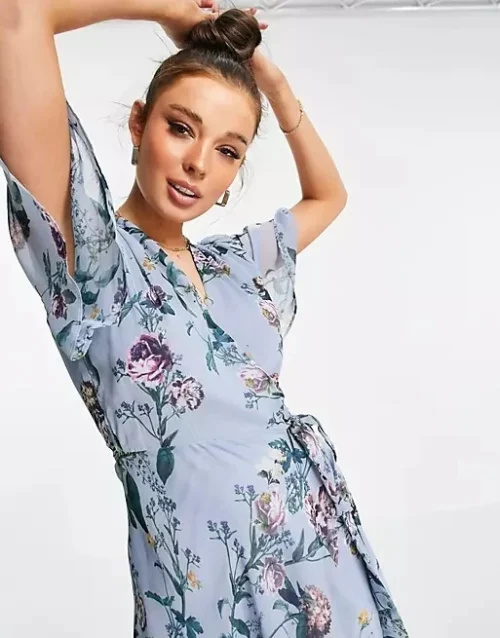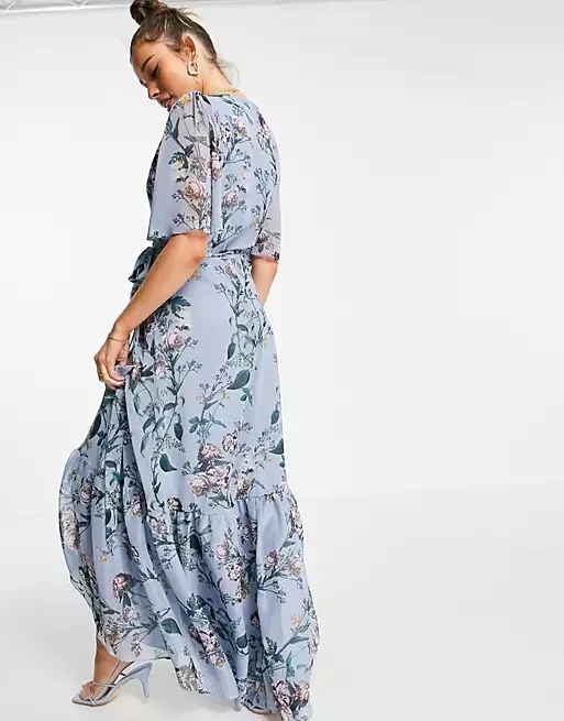 Product Name: Women’s Sexy Casual Overlapping Flair Sleeve Summer Clothing Long Sleeve Powder Blue Floral Print Dresses
