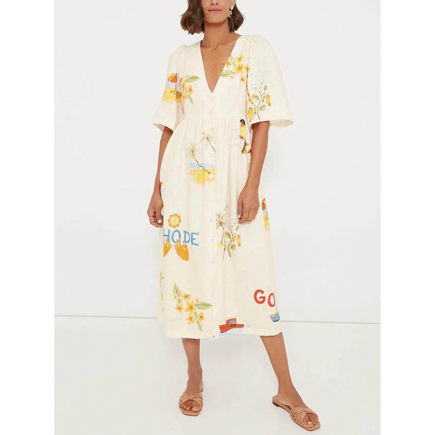 Product Name: Women’s Spring&Summer Casual Cotton and Linen Elegant Rhodes Print Hawaiian Print Short Sleeve V Neck Midi Dress
