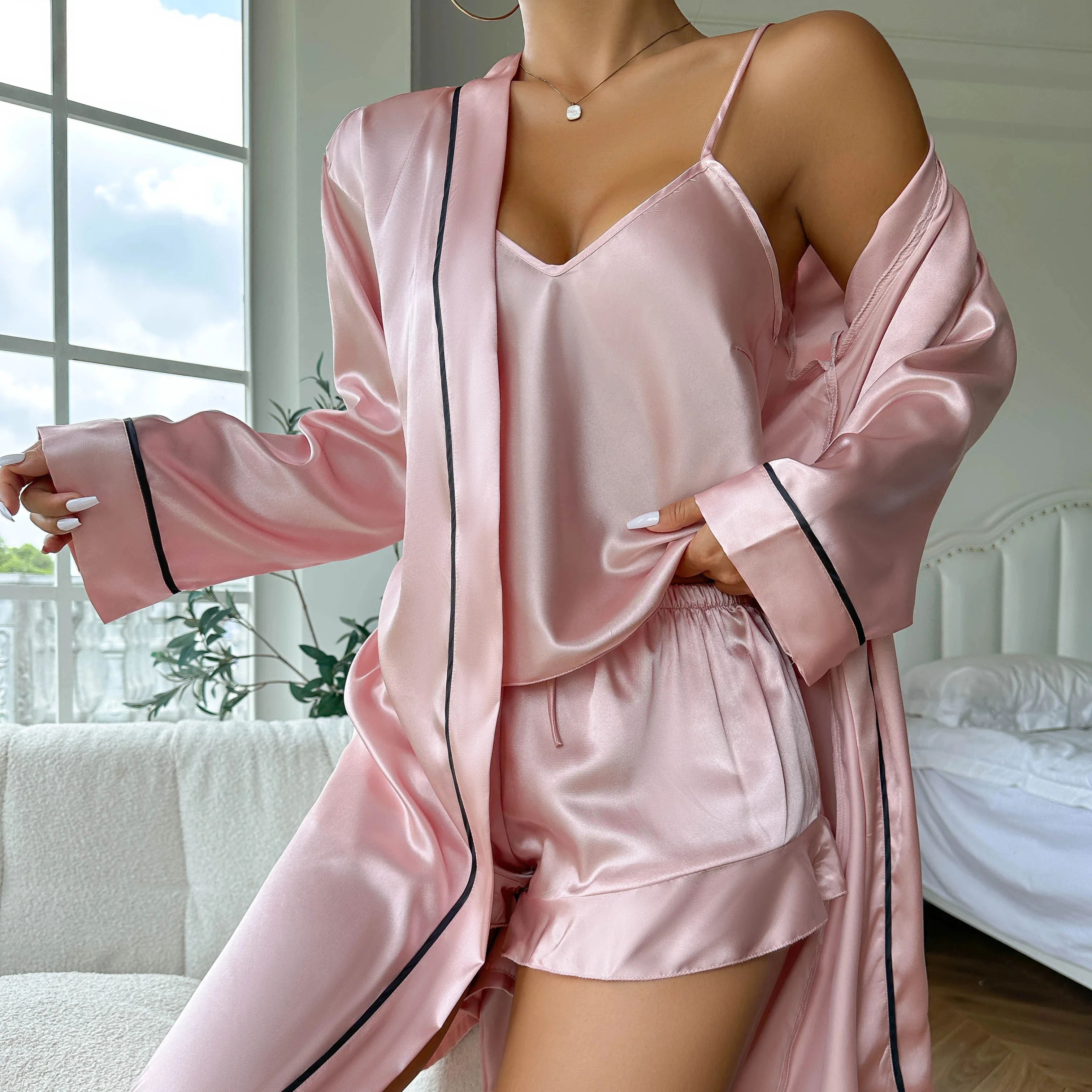 Product Name: Women’s Winter Satin Pajama Set Long Sleeve Belted Robe V-Neck Cami Top Shorts Crocheted Drawstring Closure Simple Sleepwear