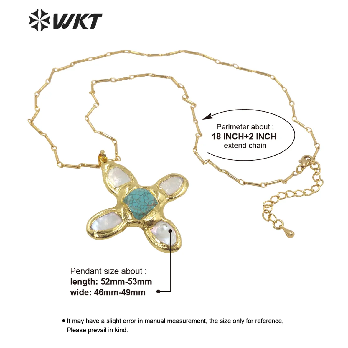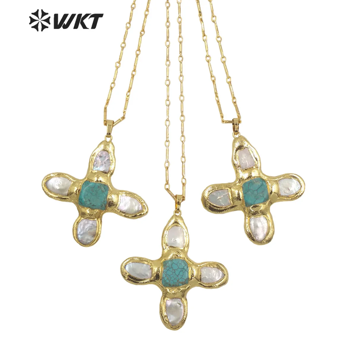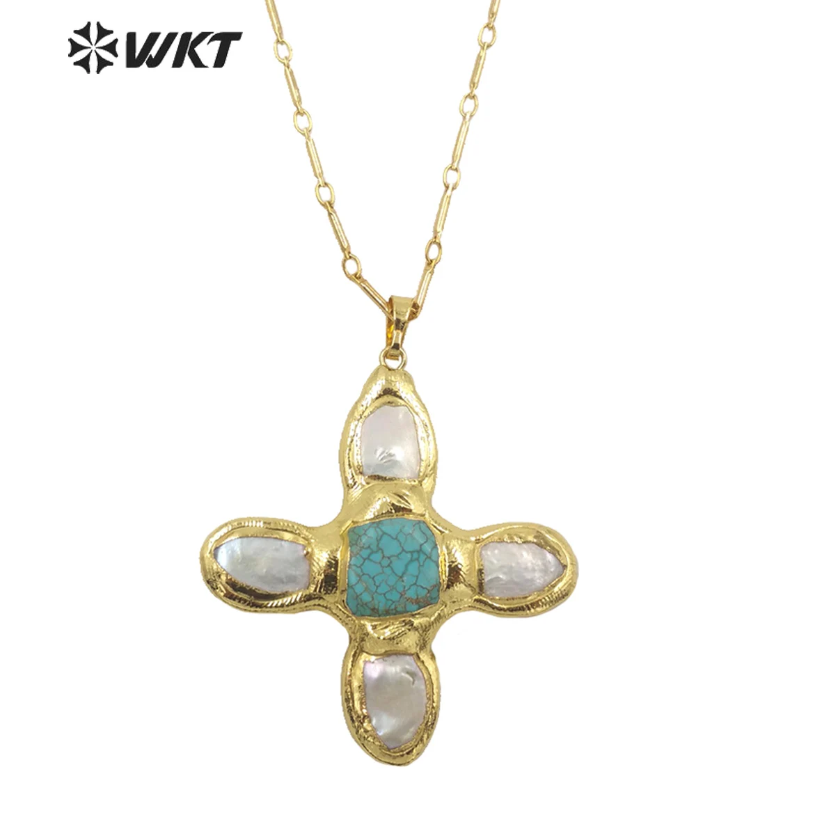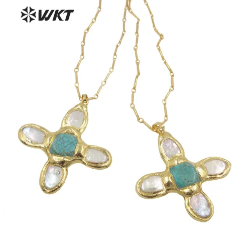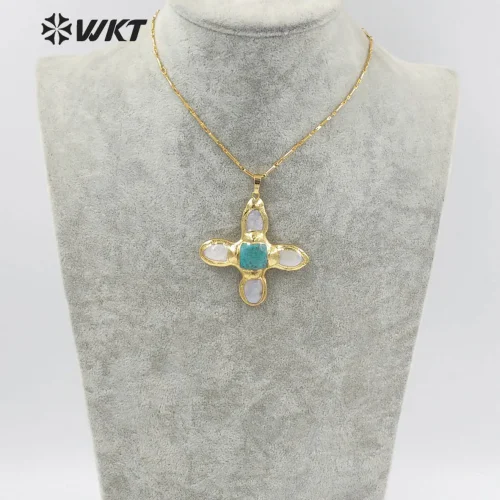 Product Name: WT-JN169 New Fashion Trendy Pearl Cross Shape Turquoises Pendant Necklace Gold Electroplated Necklace Green Stone