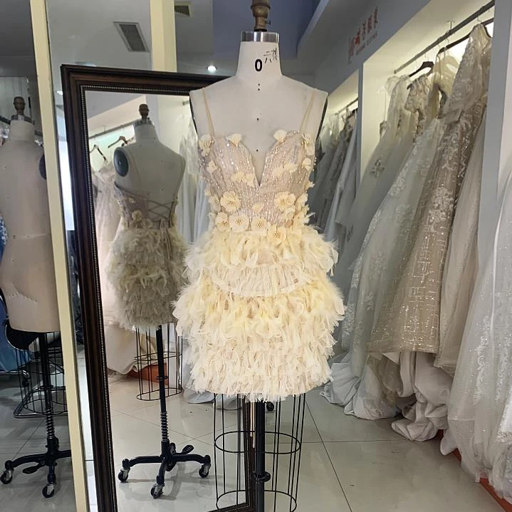 Product Name: Yellow Feather 3D Flower Spaghetti Strap Homecoming Short Dress for Girls