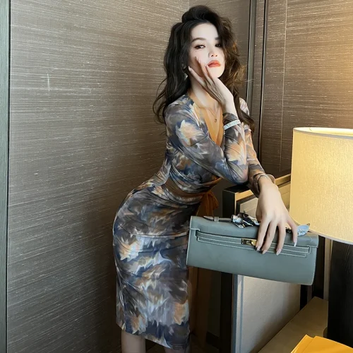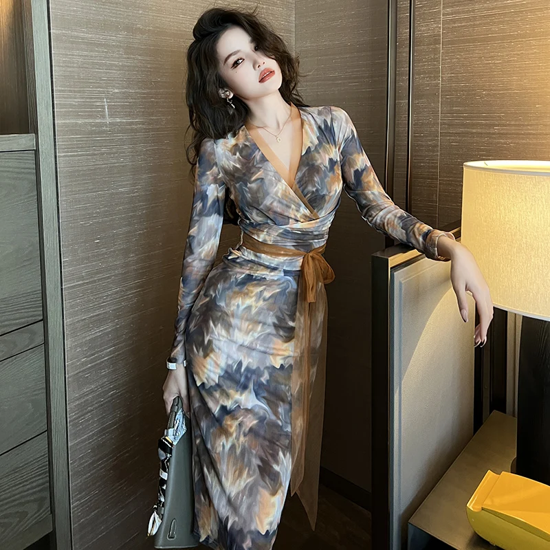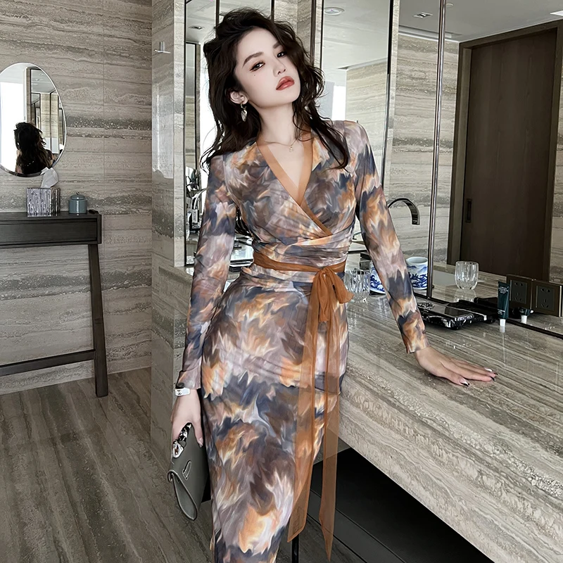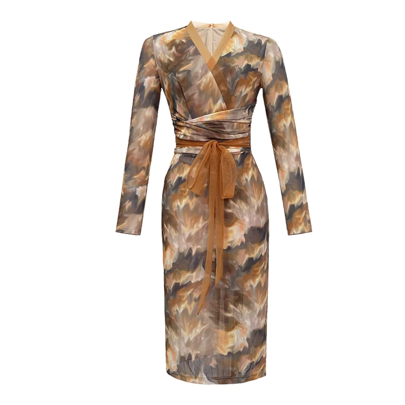 ZYHT 10196 Classy Bow V Neck Bodycon Long Sleeve Dress Ruched Waist Mesh Printed Ladies Casual Elegant Draped Dress