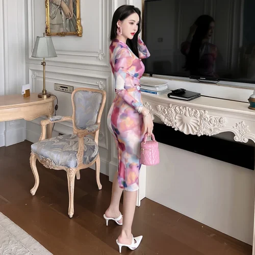 ZYHT 20190 Ladies Birthday Party Club Sundress 2022 Autumn Bodycon Elegant Sexy Tie Dye Outfits Women Long Sleeve Midi Dress