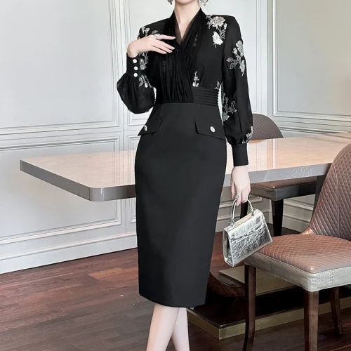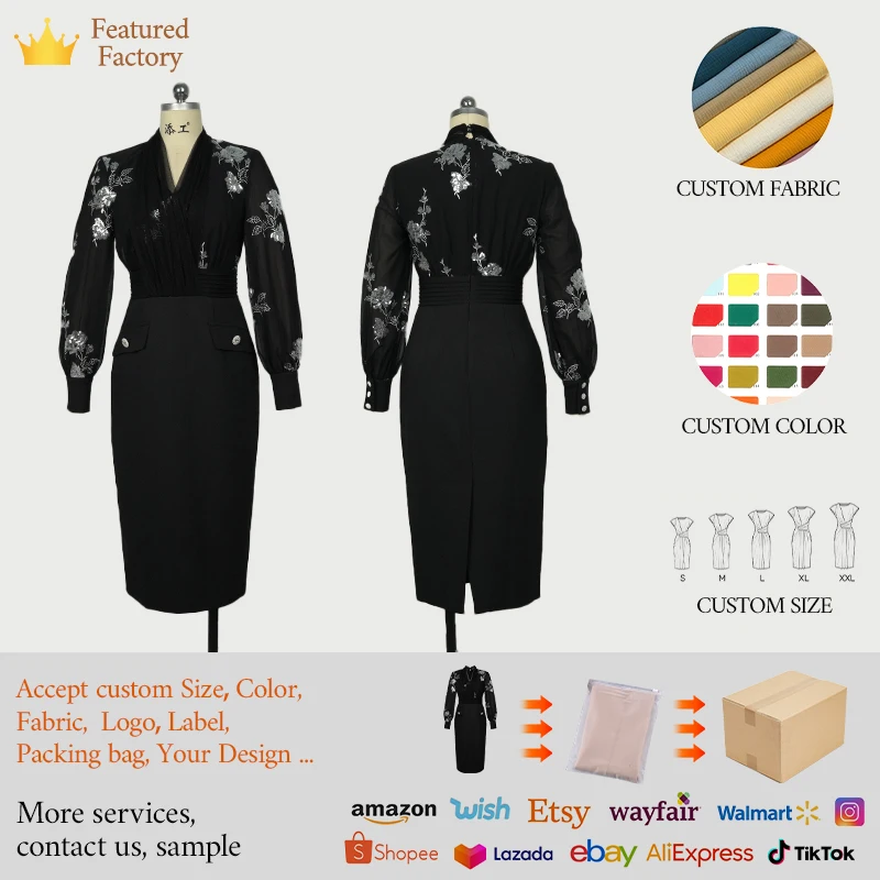 Product Name: ZYHT 51135 New Collection of Women XL Dresses Chic High Waist Sequin Formal Office Pencil Long Sleeve Dresses Lady Elegant