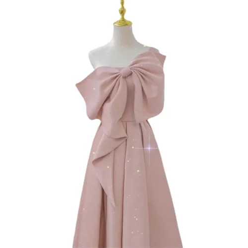 2023 Spring New Pink Bow Dress Elegant Host Banquet Evening Dress Sleeveless Solid Color Satin Evening Dress