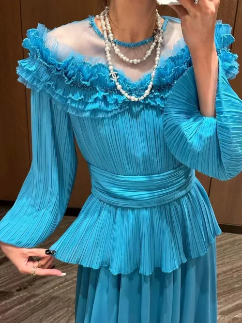 YC Women Pleated Full Sleeve Dress Spring Summer Collar Mesh Patchwork See-through Beading Ruffles Layer Long Party