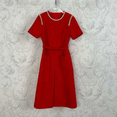 YC Runway Fashion Elegant Midi Dress Women 2025 Spring Summer Solid Red Beige Luxury Diamonds Belt Office Ladies Party