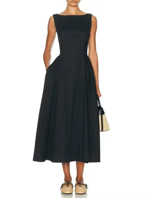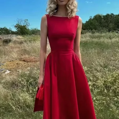 2025 Summer New Round Neck Backless Pleated A-line Long Dress French Elegant Sleeveless Tight Red Party Casual Dresses