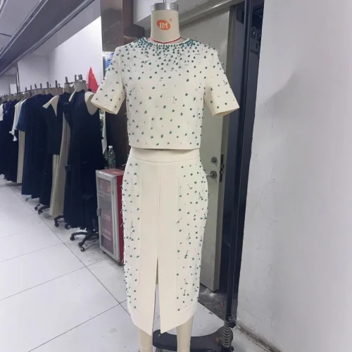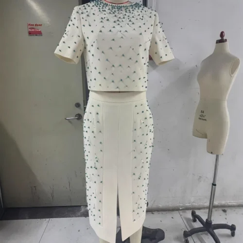 2025 Summer New Elegant Socialite Suit Dress for Women Korean Heavy Industry Nail Beaded Thread Neck Floral Casual Short Sleeved