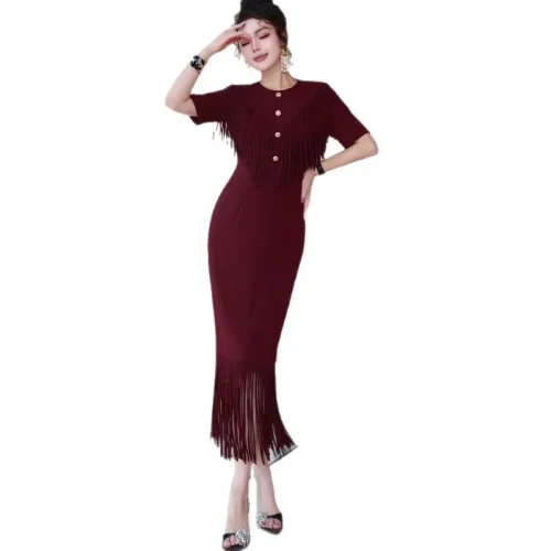2025 Summer European American Women’s Elegant Purple Floor-Length Dress Hip-Hugging Short-Sleeved Slimming Look with Tassel Neck