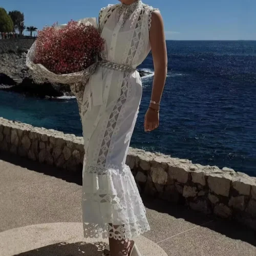 2025 Summer Fashion Button Vest Holiday Long Women’s Dresses Hollow Out Lace Patchwork French Elegant Blue Casual Dresses