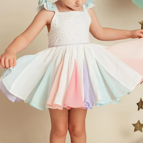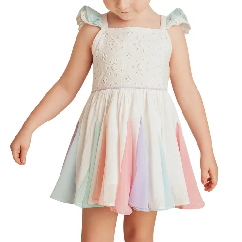 Baby Girls Flutter Sleeve White Eyelet Lace Bodice Rainbow Dress Casual Wear Smocked Tie Back Mini Dresses