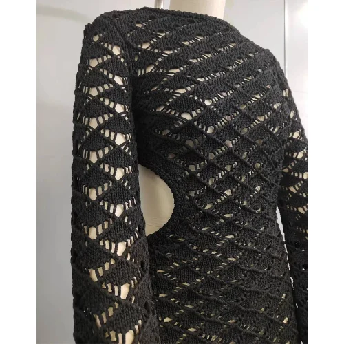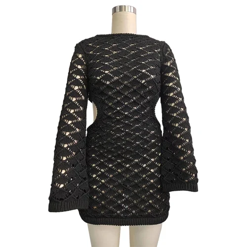 Crochet Linen Cotton Woman Knitted Cut Out Open Back Black Beach Cover up Dresses Sexy Beach Mini Crochet Dress