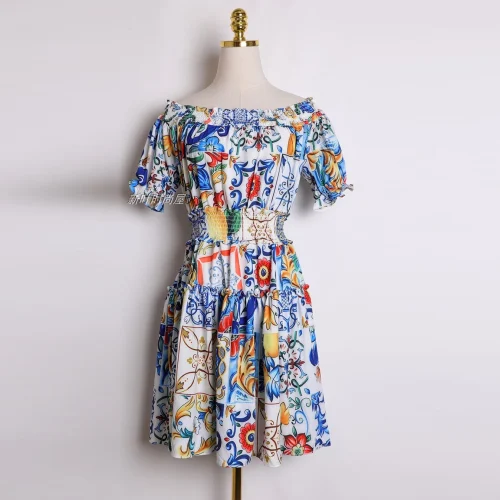 Fashion Casual Short Dress 2025 Spring Women’s Off-Shoulder Short Sleeve Blue and White Porcelain Print Elastic Waist