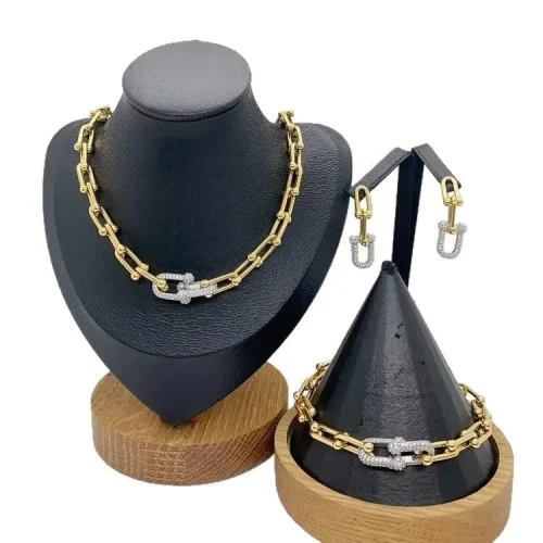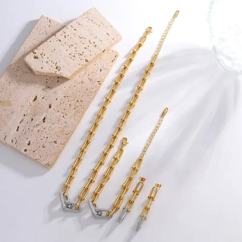 18K Gold Plated Jewelry Set Unique U Shape Choker Necklace Bracelet Earrings Trendy Thick Chunky Design with Zircon Stones