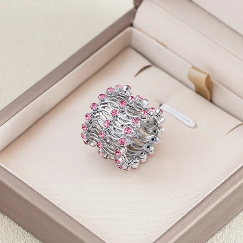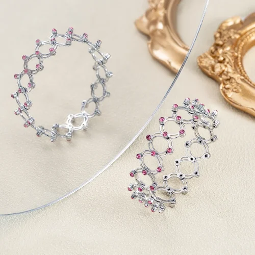 Adjustable Vintage Style Stainless Steel Ring Bangle with Pink Zircon for Various Finger Sizes Wedding Gift Jewelry