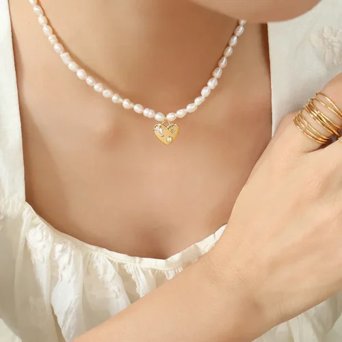 AIZL Handmade Beaded Pearl Imitation Titanium Steel Gold Plated love Pendant Necklace Female Fashion commuter Clavicle Chain
