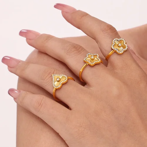 s Waterproof Tarnish Free Stainless Steel 18K Gold Plated Women Flower Heart Adjustable Zircon Fashion Jewelry Rings