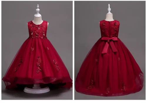 New Style Kids Flower Girl Dress Red Wine Color Hand Work Beads Wedding Lace Embroidered Dress