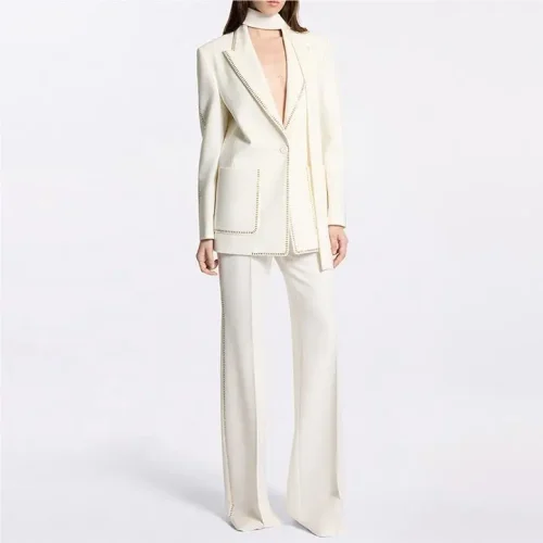 Newest 2025 Lady Formal Workwear 2Pcs Solid Drilling Notched Long Sleeve Single Button Blazer Pants Suit With Scarf
